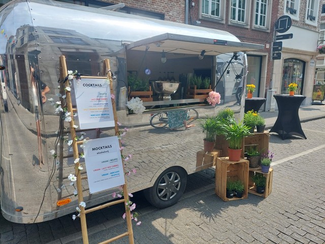 Een glimmende Airstreamer, en bar op wielen En cocktails die ter plekke worden geshaket.